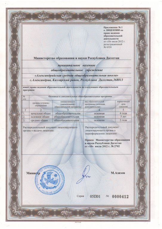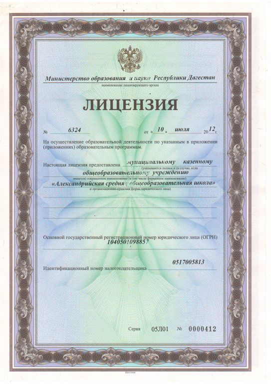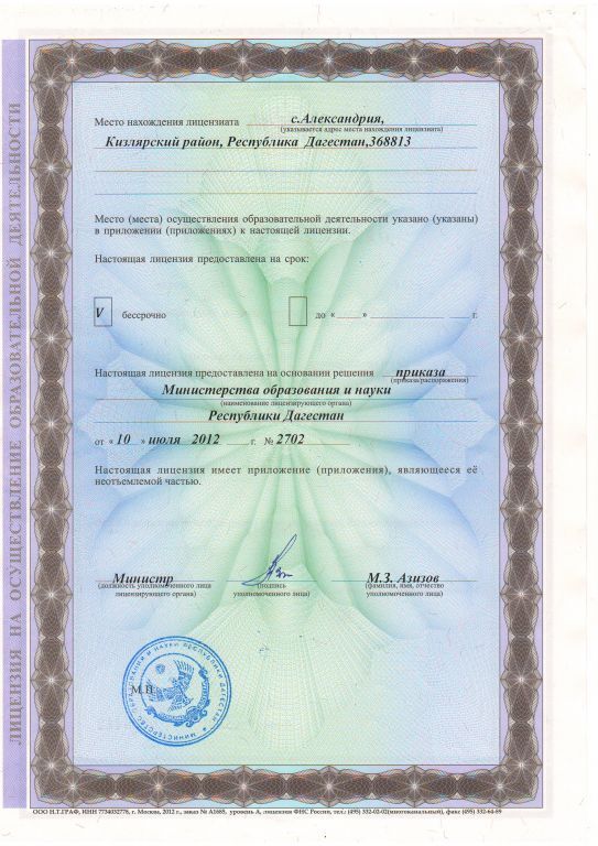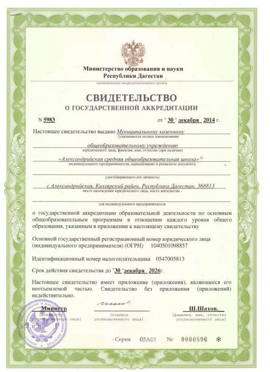 | Адрес местонахождения образовательной организации* | 368813, Республика Дагестан, Кизлярский район, с. Александрийская, ул. Ленина, д. 30 |